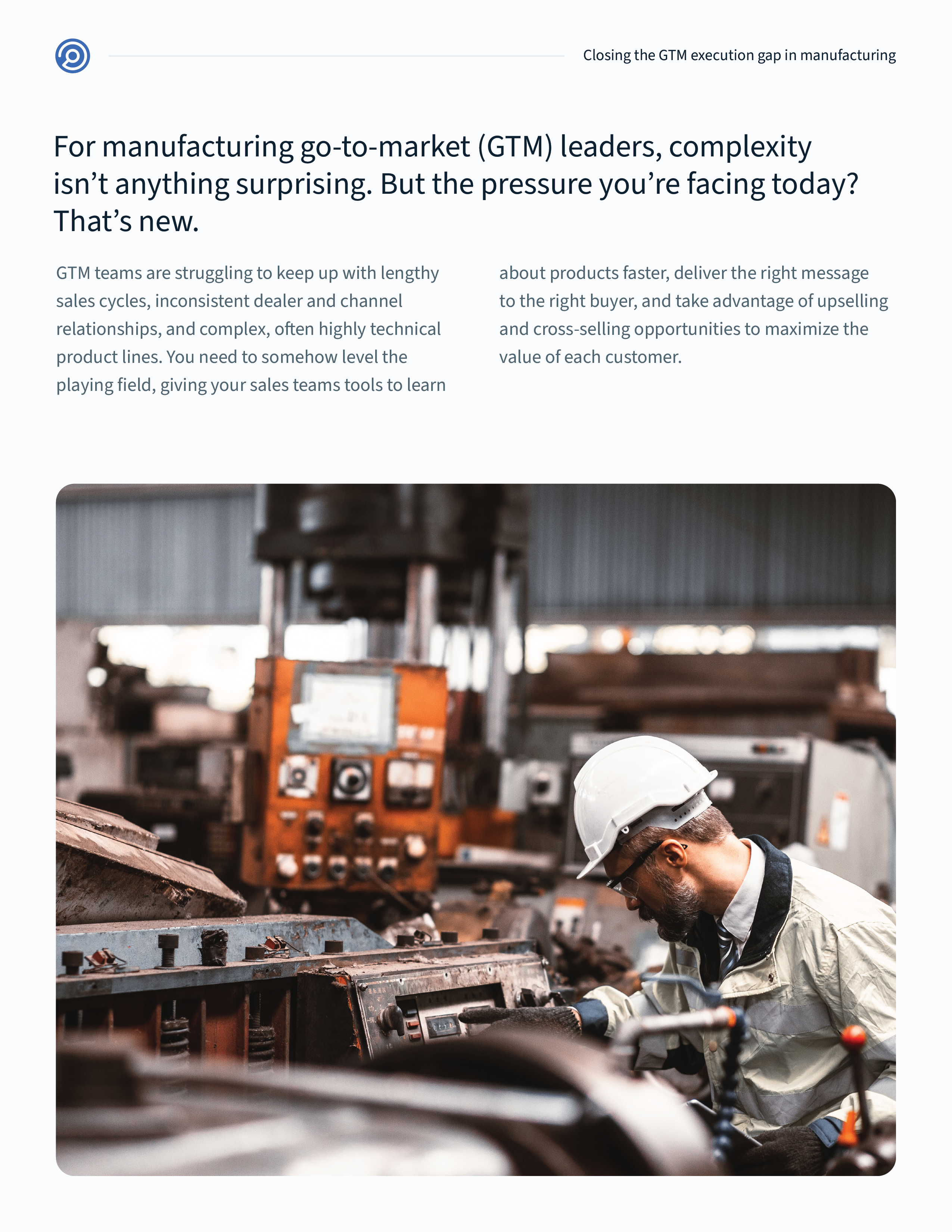 GTM teams are struggling to keep up with lengthy sales cycles, inconsistent dealer and channel relationships, and complex, often highly technical product lines. You need to somehow level the playing field, giving your sales teams tools to learn about products faster, deliver the right message to the right buyer, and take advantage of upselling and cross-selling opportunities to maximize the value of each customer.