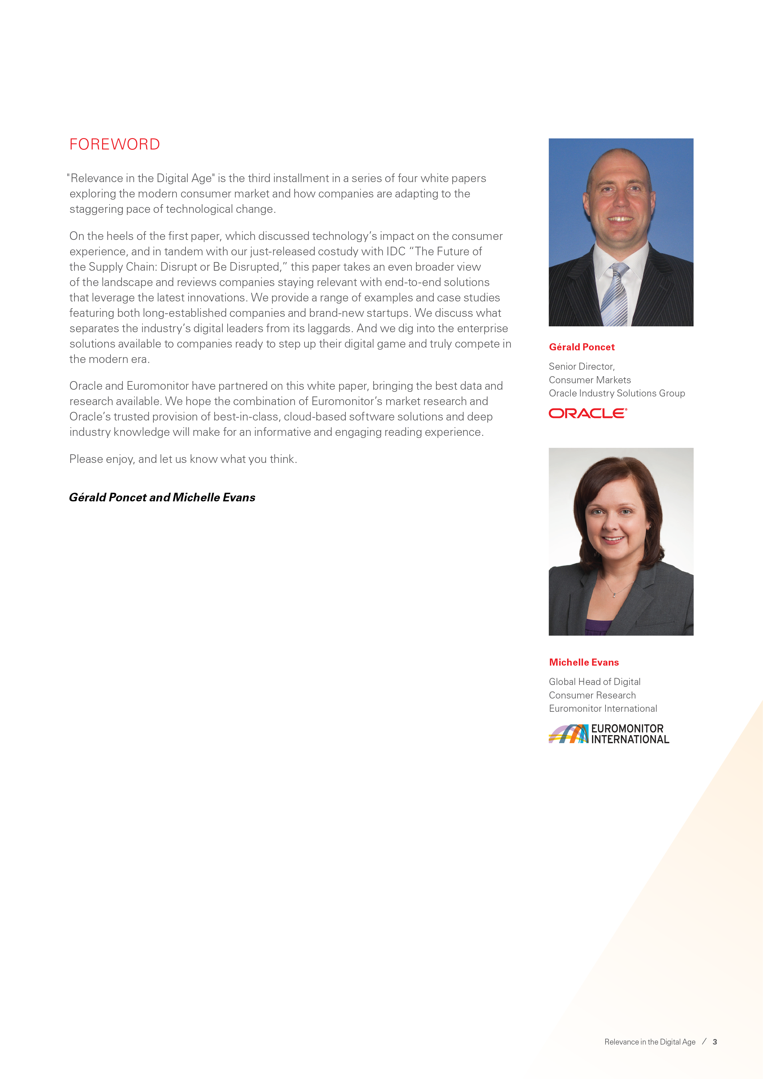 On the heels of the first paper, which discussed technology’s impact on the consumer experience, and in tandem with our just-released costudy with IDC “The Future of the Supply Chain: Disrupt or Be Disrupted,” this paper takes an even broader view of the landscape and reviews companies staying relevant with end-to-end solutions that leverage the latest innovations. We provide a range of examples and case studies featuring both long-established companies and brand-new startups. We discuss what separates the industry’s digital leaders from its laggards. And we dig into the enterprise solutions available to companies ready to step up their digital game and truly compete in the modern era.