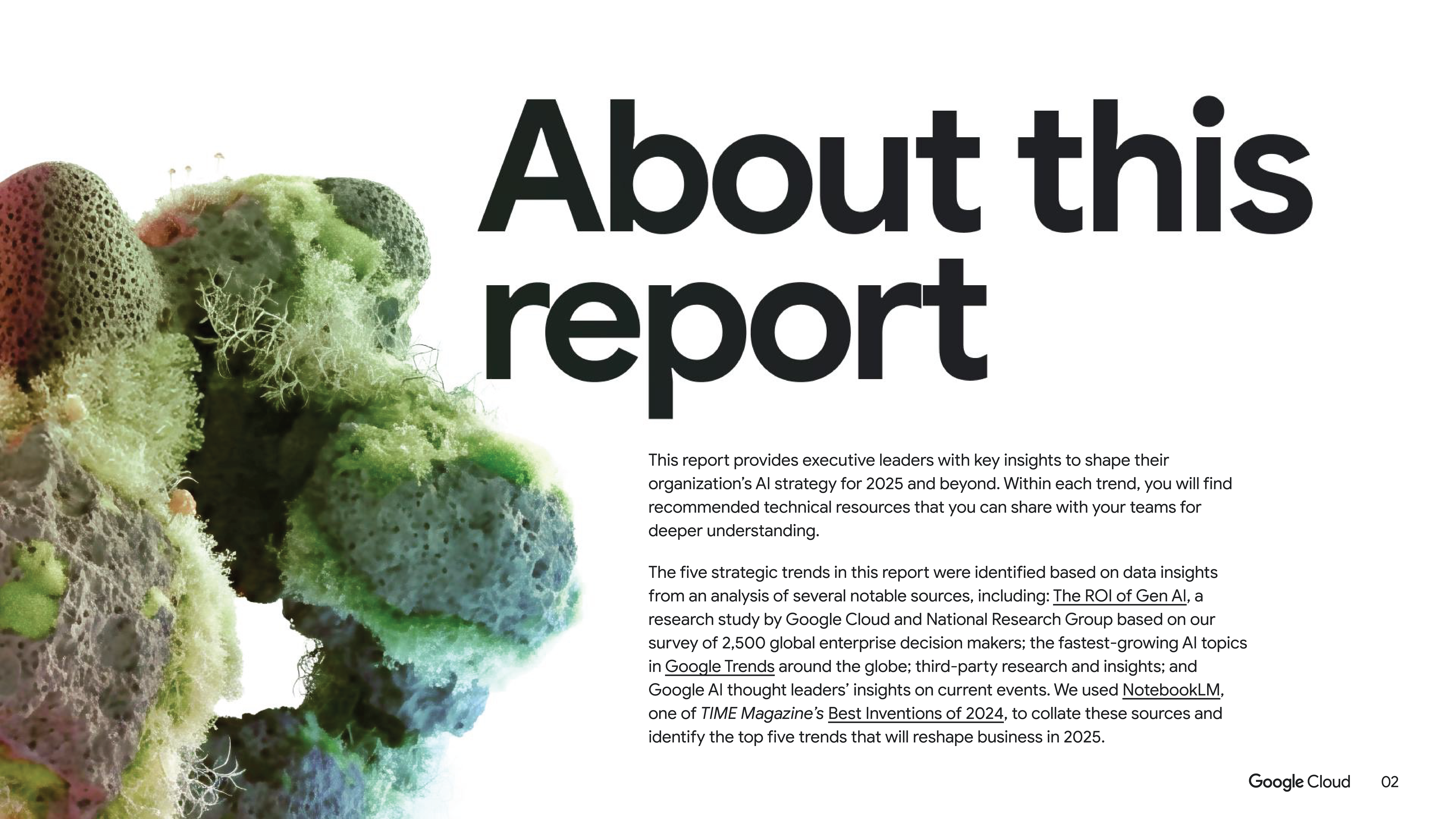 The five strategic trends in this report were identified based on data insights from an analysis of several notable sources, including: The ROI of Gen AI, a research study by Google Cloud and National Research Group based on our survey of 2,500 global enterprise decision makers; the fastest-growing AI topics in Google Trends around the globe; third-party research and insights; and Google AI thought leaders’ insights on current events. We used NotebookLM, one of TIME Magazine’s Best Inventions of 2024, to collate these sources and identify the top five trends that will reshape business in 2025.